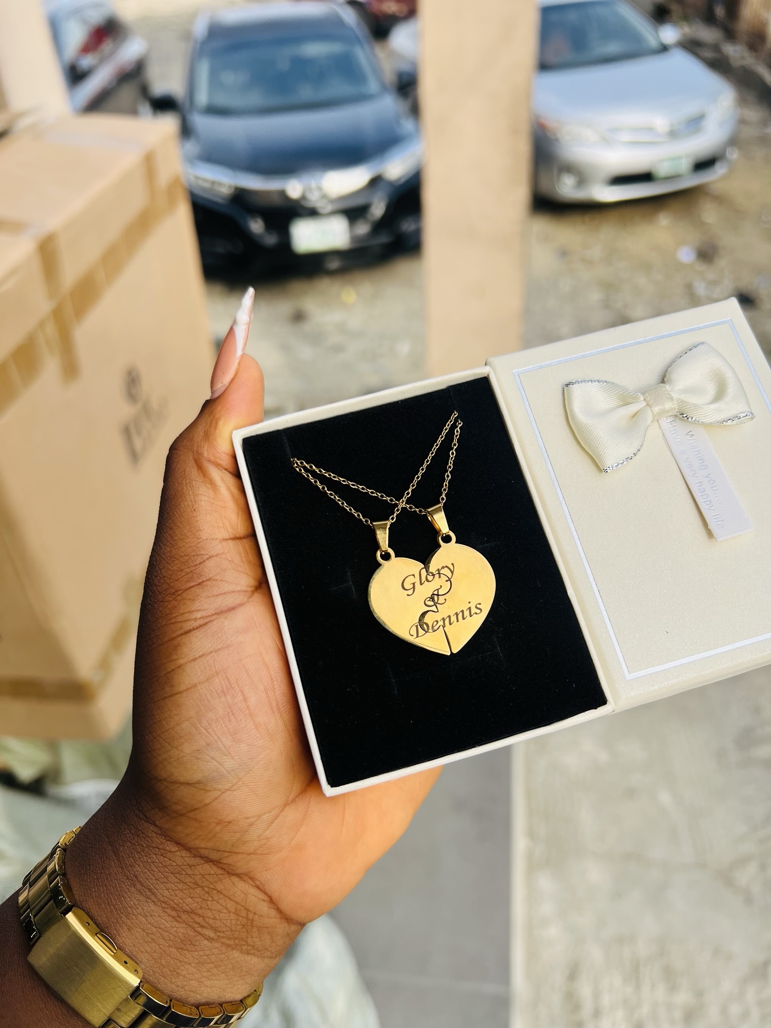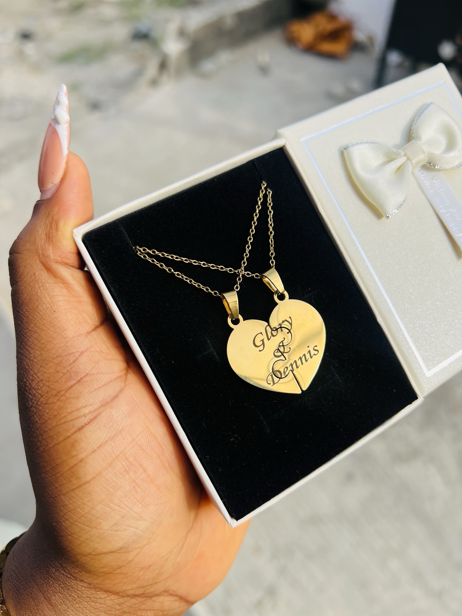 Previous Product Next Product Engraved couple puzzle necklace ₦7,000 Category: Customizables 42 in stock Engraved couple puzzle necklace quantity Buy Now Reviews (0) Reviews There are no reviews yet. Be the first to review “Engraved couple puzzle necklace” Cancel replyYour email address will not be published. Required fields are marked *Your rating * Rate… Perfect Good Average Not that bad Very poor Your review *Name * Email * Save my name, email, and website in this browser for the next time I comment. Opens in a new window Tweet This Product Opens in a new window Share on Facebook Opens in a new window Pin This Product Opens in a new window Mail This Product Related products Quick View Quick View CustomizablesSilver circle locket necklace with paper box ₦15,900 Buy Now Quick View Quick View CustomizablesBlack oval engraved necklace ₦6,000 Buy Now Quick View Quick View CustomizablesSilver Casio watch combo with box ₦29,500 Buy Now