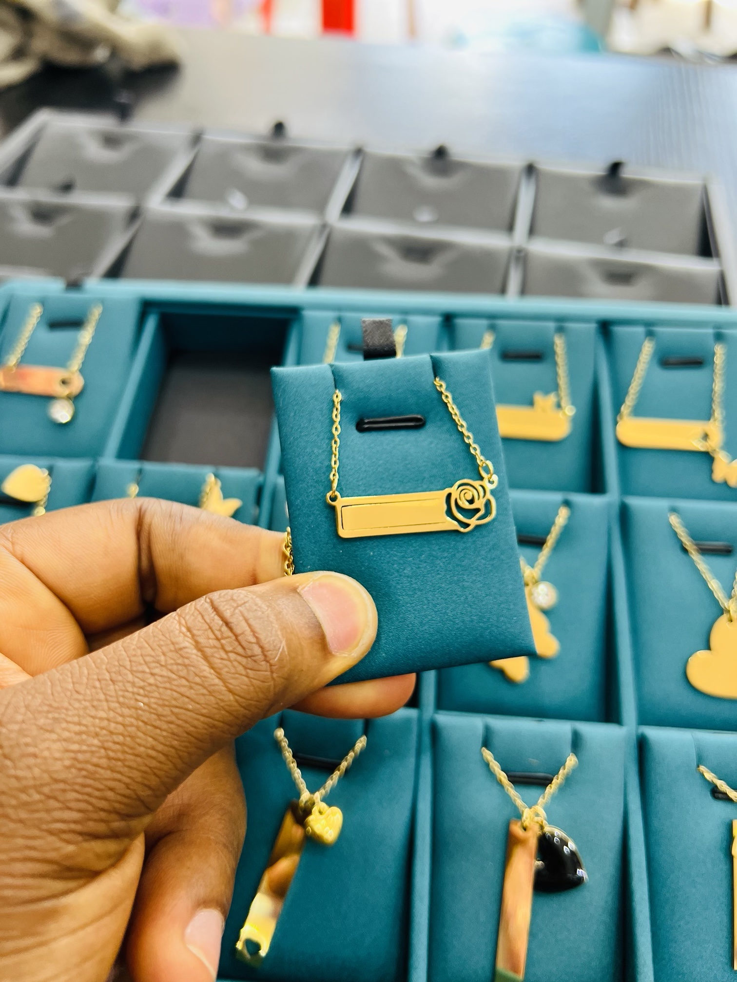 Previous Product Next Product Engraved female rose necklace ₦6,099 Category: Customizables 99 in stock Engraved female rose necklace quantity Buy Now Reviews (0) Reviews There are no reviews yet. Be the first to review “Engraved female rose necklace” Cancel replyYour email address will not be published. Required fields are marked *Your rating * Rate… Perfect Good Average Not that bad Very poor Your review *Name * Email * Save my name, email, and website in this browser for the next time I comment. Opens in a new window Tweet This Product Opens in a new window Share on Facebook Opens in a new window Pin This Product Opens in a new window Mail This Product Related products Quick View Quick View CustomizablesSilver heart shaped locket with paper box ₦15,900 Buy Now Quick View Quick View CustomizablesMale Engraved Rolex combo with box ₦34,000 Buy Now Quick View Quick View CustomizablesSilver circle locket necklace with paper box ₦15,900 Buy Now