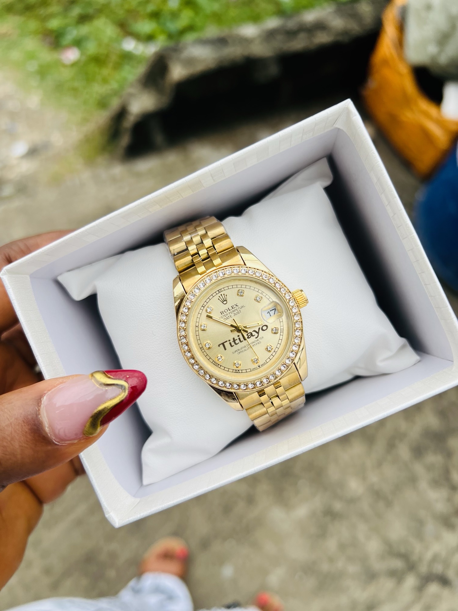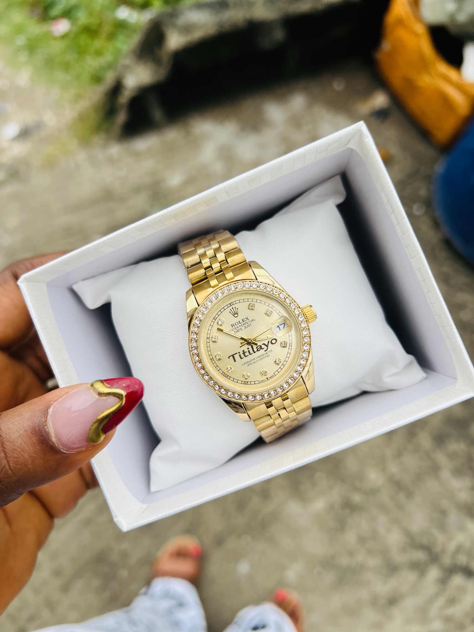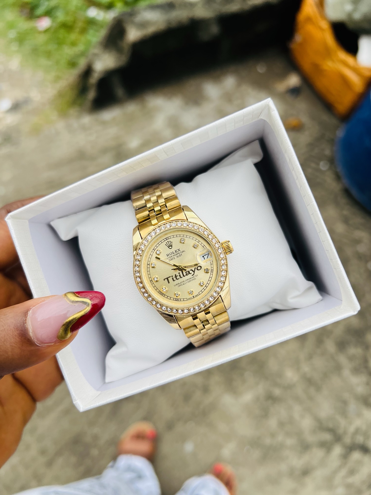 Previous Product Next Product Engraved stoned Rolex female watch ₦15,000 Category: Customizables 16 in stock Engraved stoned Rolex female watch quantity Buy Now Reviews (0) Reviews There are no reviews yet. Be the first to review “Engraved stoned Rolex female watch” Cancel replyYour email address will not be published. Required fields are marked *Your rating * Rate… Perfect Good Average Not that bad Very poor Your review *Name * Email * Save my name, email, and website in this browser for the next time I comment. Opens in a new window Tweet This Product Opens in a new window Share on Facebook Opens in a new window Pin This Product Opens in a new window Mail This Product Related products Quick View Quick View CustomizablesEngraved female gold infinity necklace ₦4,500 Rated 5.00 out of 5Buy Now Quick View Quick View CustomizablesPresidential rebirth with love engraved bracelet ₦18,000 Buy Now Quick View Quick View Customizables12mm Gold Rolex bracelet ₦6,599 Buy Now