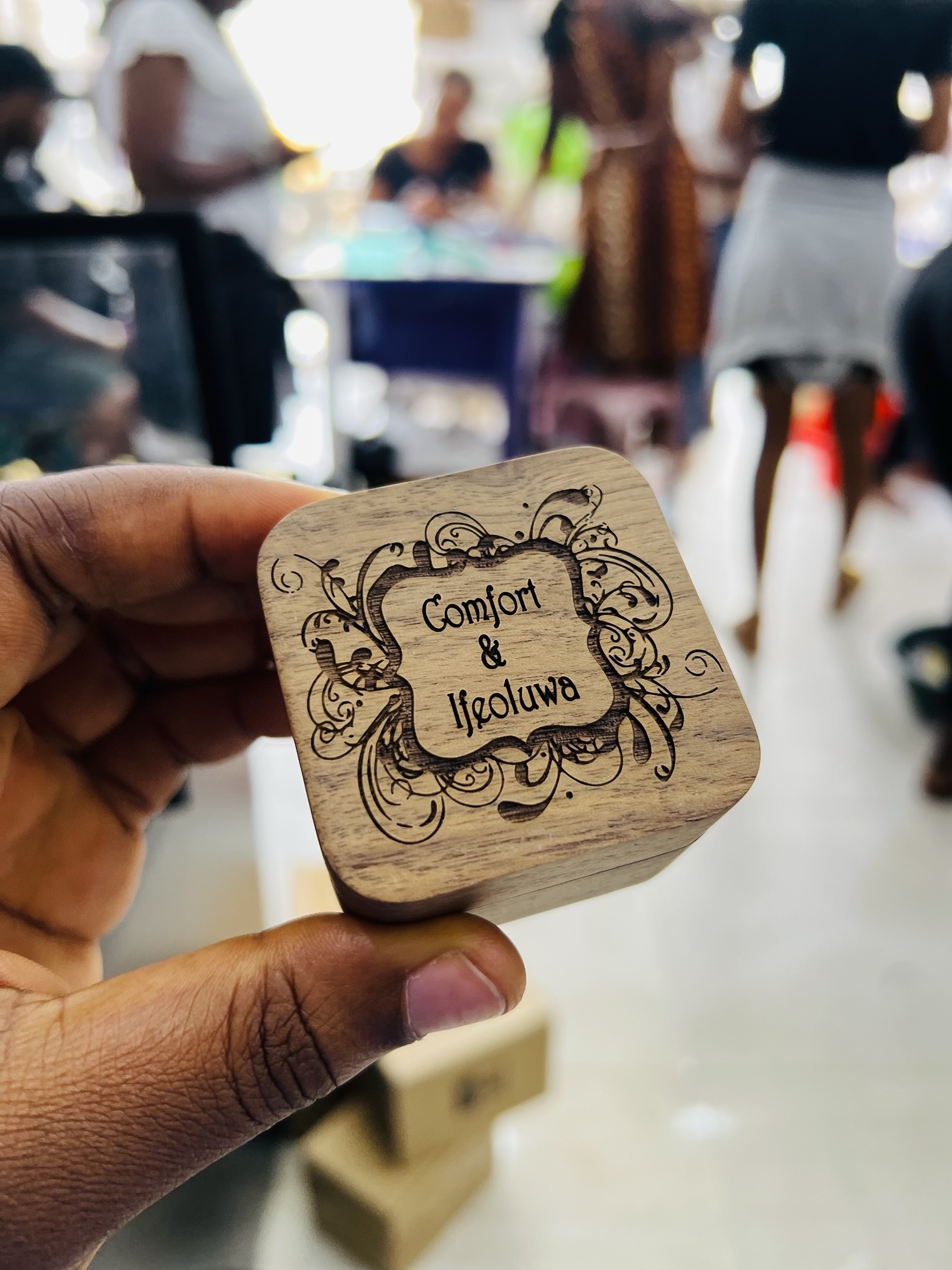 Previous Product Next Product Engraved wooden ring box ₦6,000 Category: Customizables 35 in stock Engraved wooden ring box quantity Buy Now Reviews (0) Reviews There are no reviews yet. Be the first to review “Engraved wooden ring box” Cancel replyYour email address will not be published. Required fields are marked *Your rating * Rate… Perfect Good Average Not that bad Very poor Your review *Name * Email * Save my name, email, and website in this browser for the next time I comment. Opens in a new window Tweet This Product Opens in a new window Share on Facebook Opens in a new window Pin This Product Opens in a new window Mail This Product Related products Quick View Quick View CustomizablesGold stretchy bracelet ₦7,500 Buy Now Quick View Quick View CustomizablesCriss cross engraved black combo ₦14,099 Buy Now Quick View Out of Stock Quick View CustomizablesWhite face Rolex watch and bracelet ₦25,000 Read more