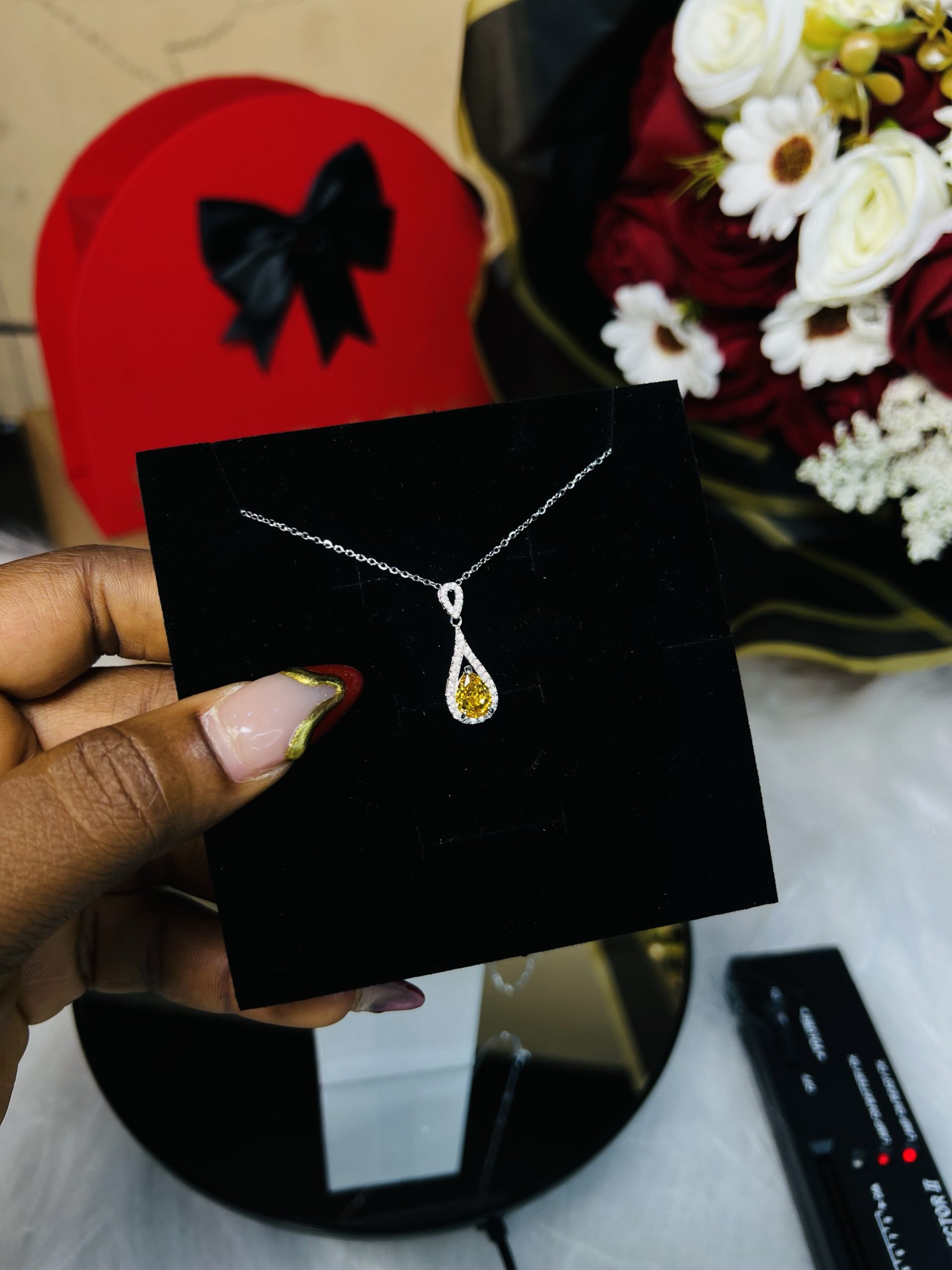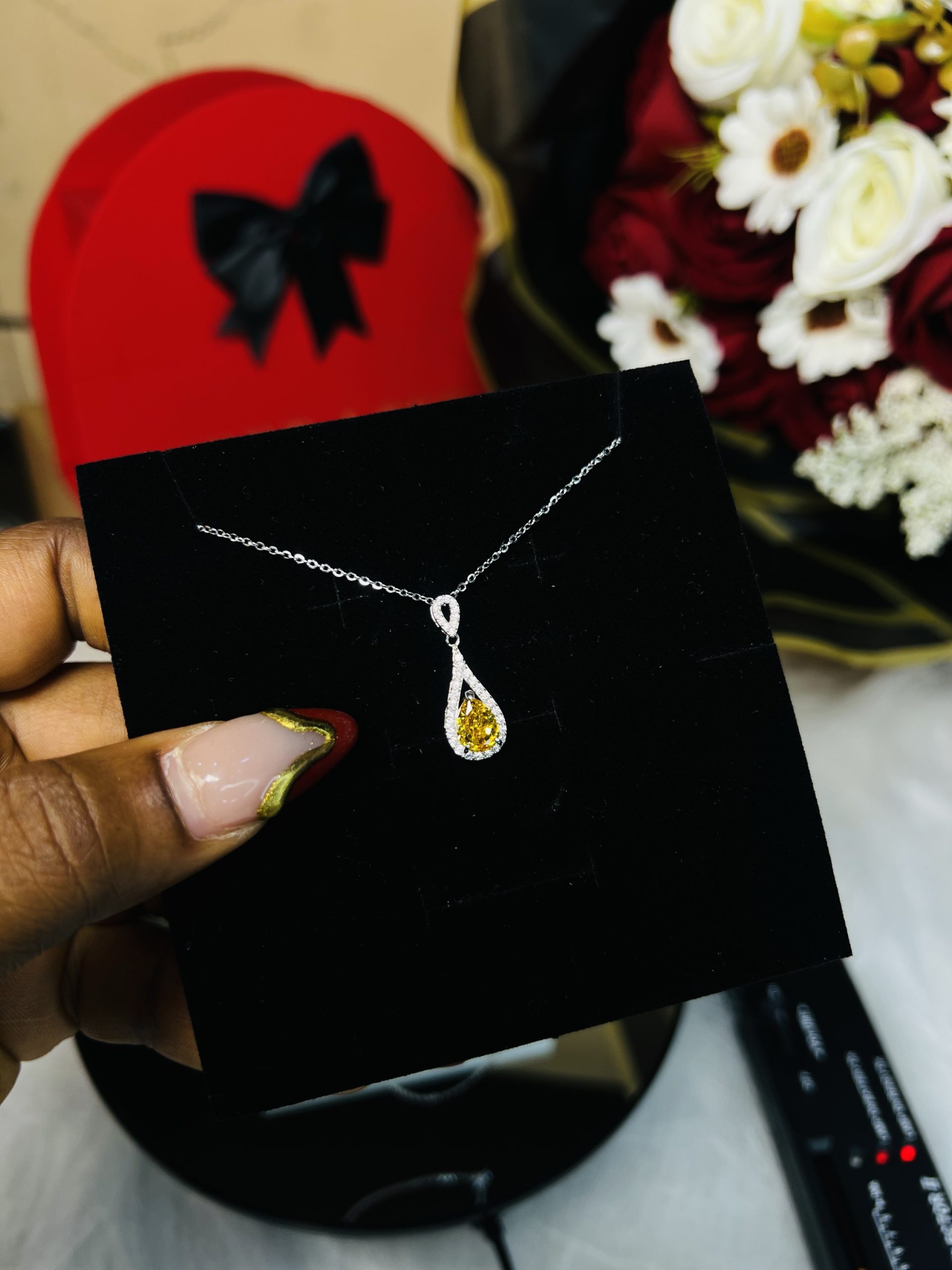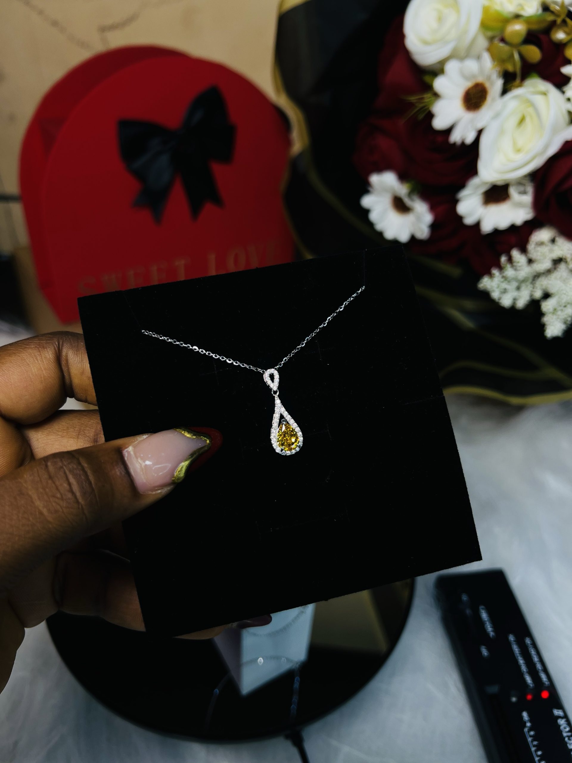 A yellow almond synthetic cubic zirconia pendant set on 92.5% sterling silver, weighing 2.96g.