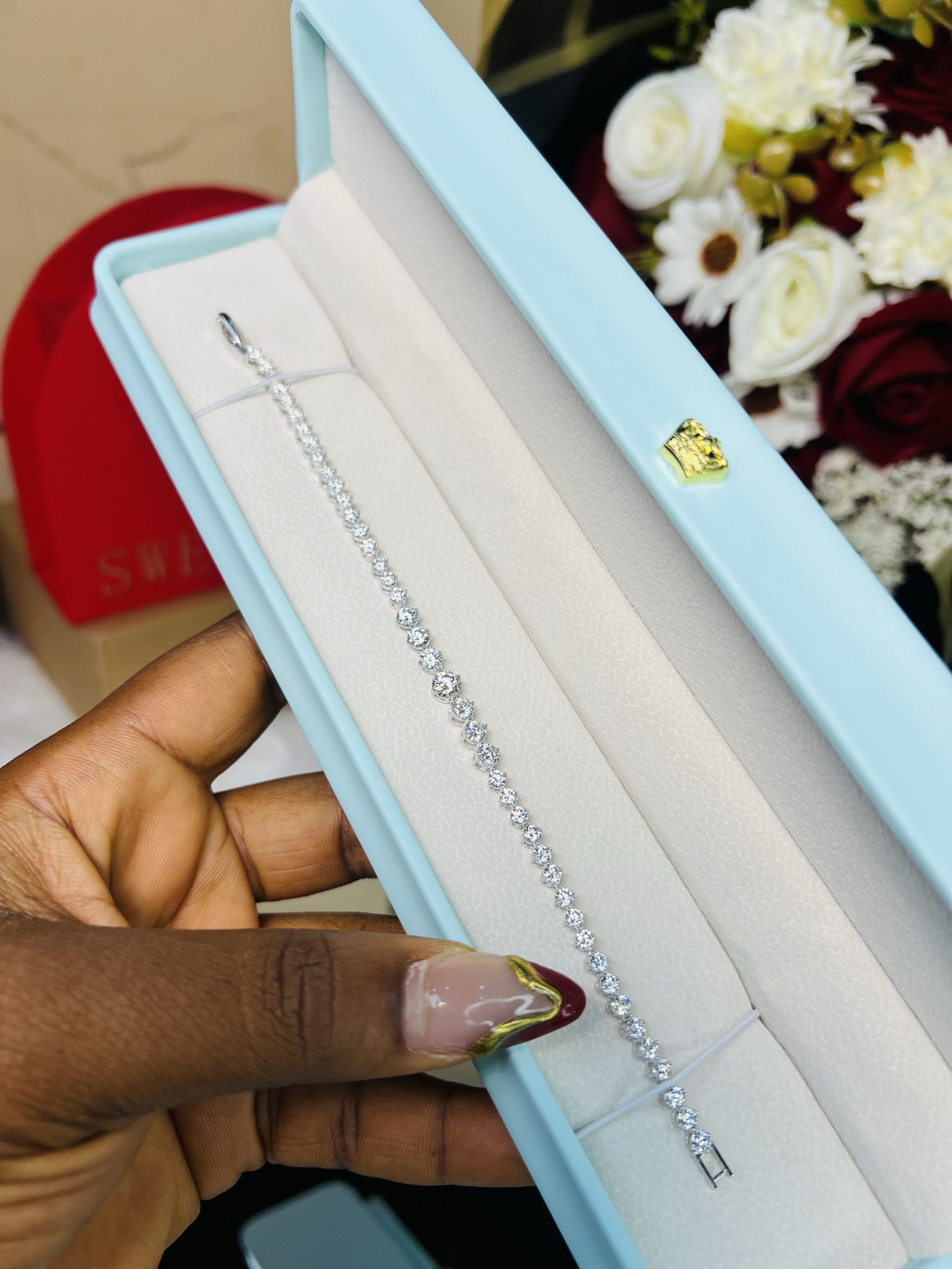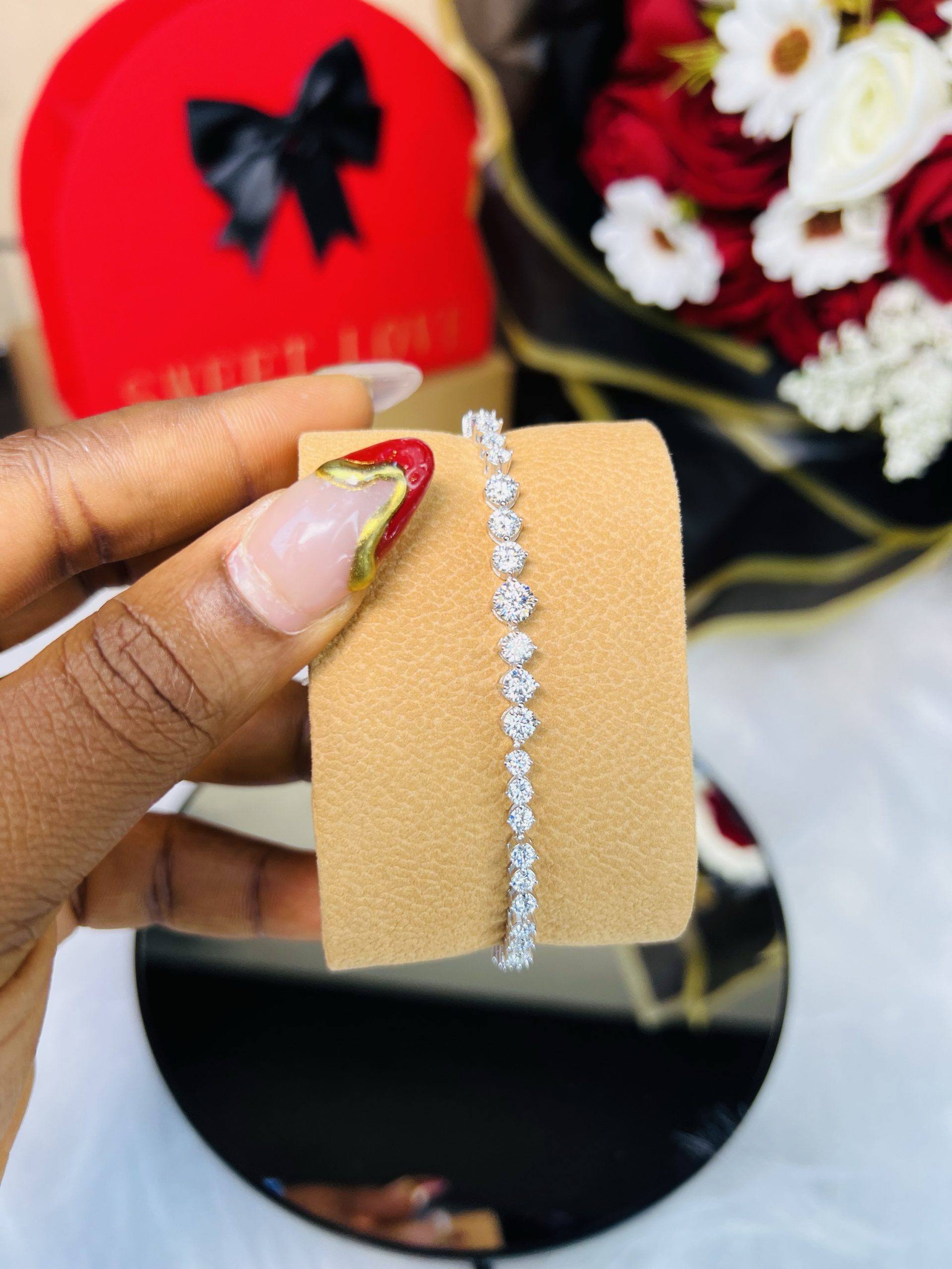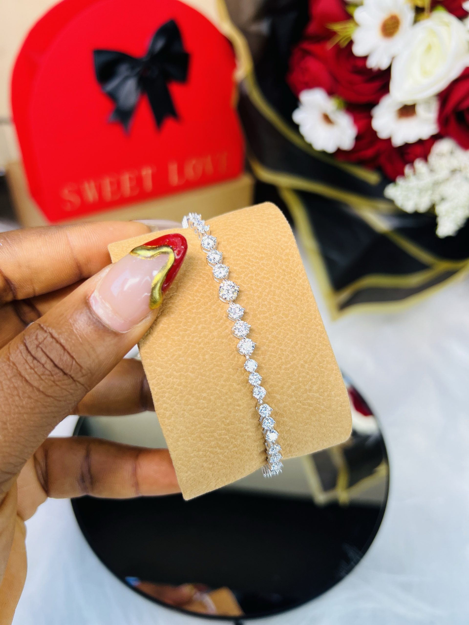 This bracelet is crafted from 925 silver and set with 42 round-cut synthetic moissanite stones totaling 5.90 carats. Total weight: 7.7g. Authenticated and reviewed by certified appraisers.