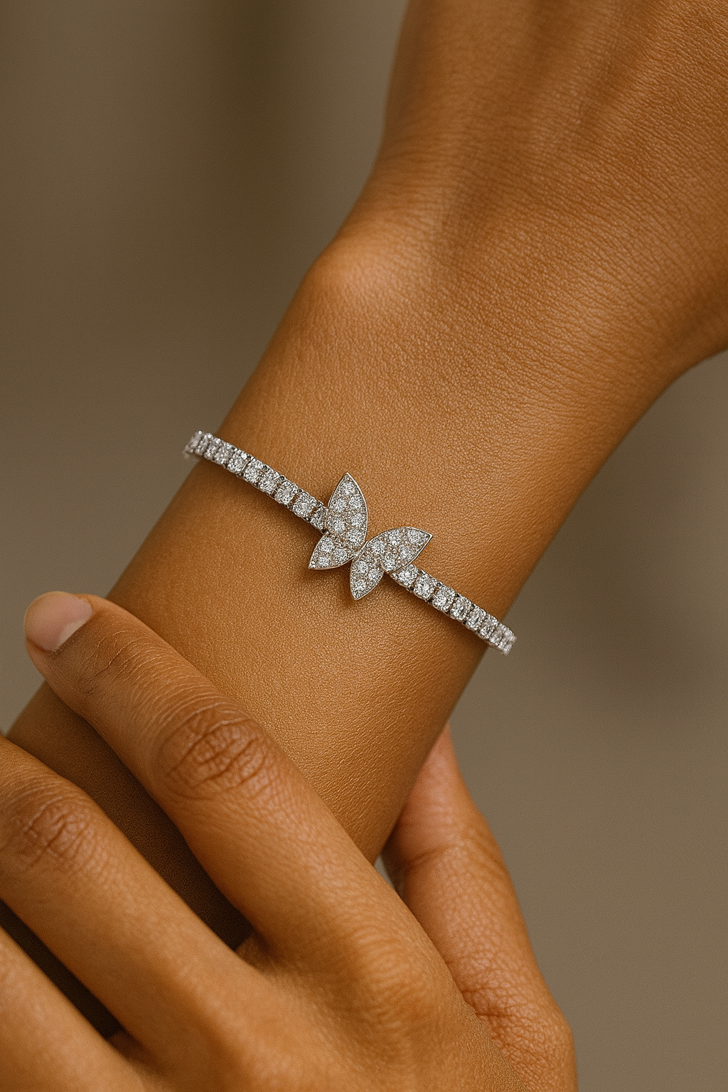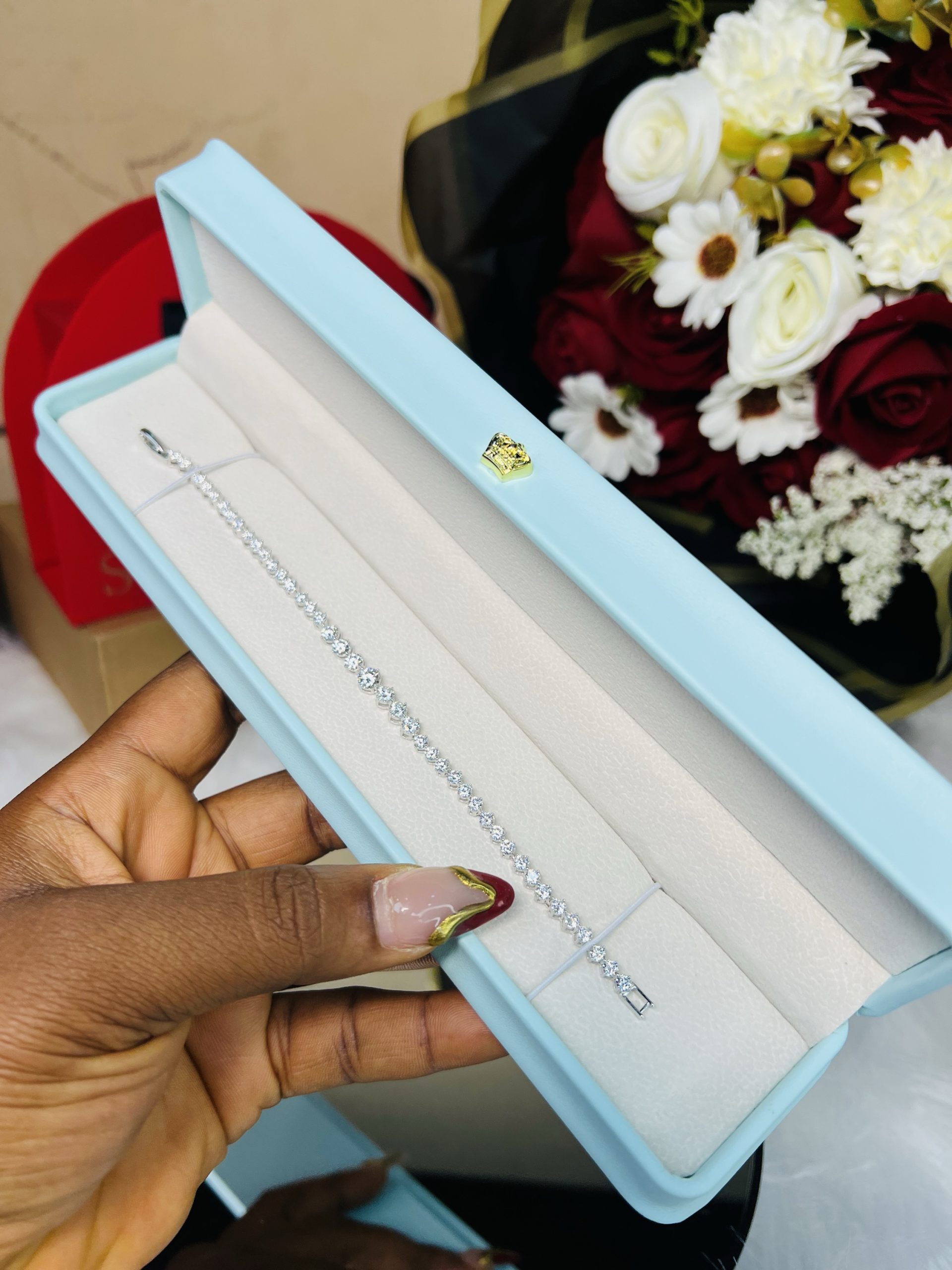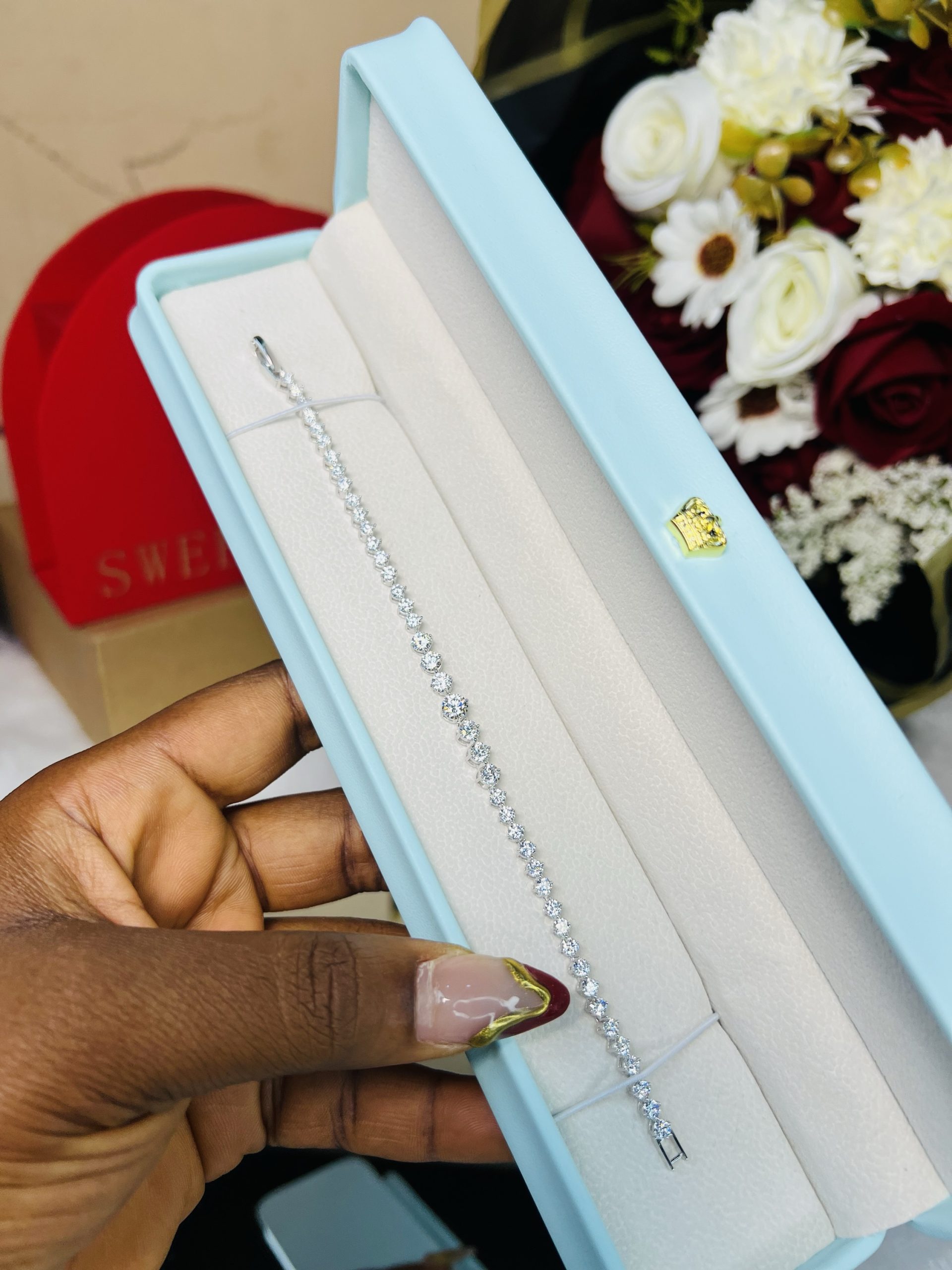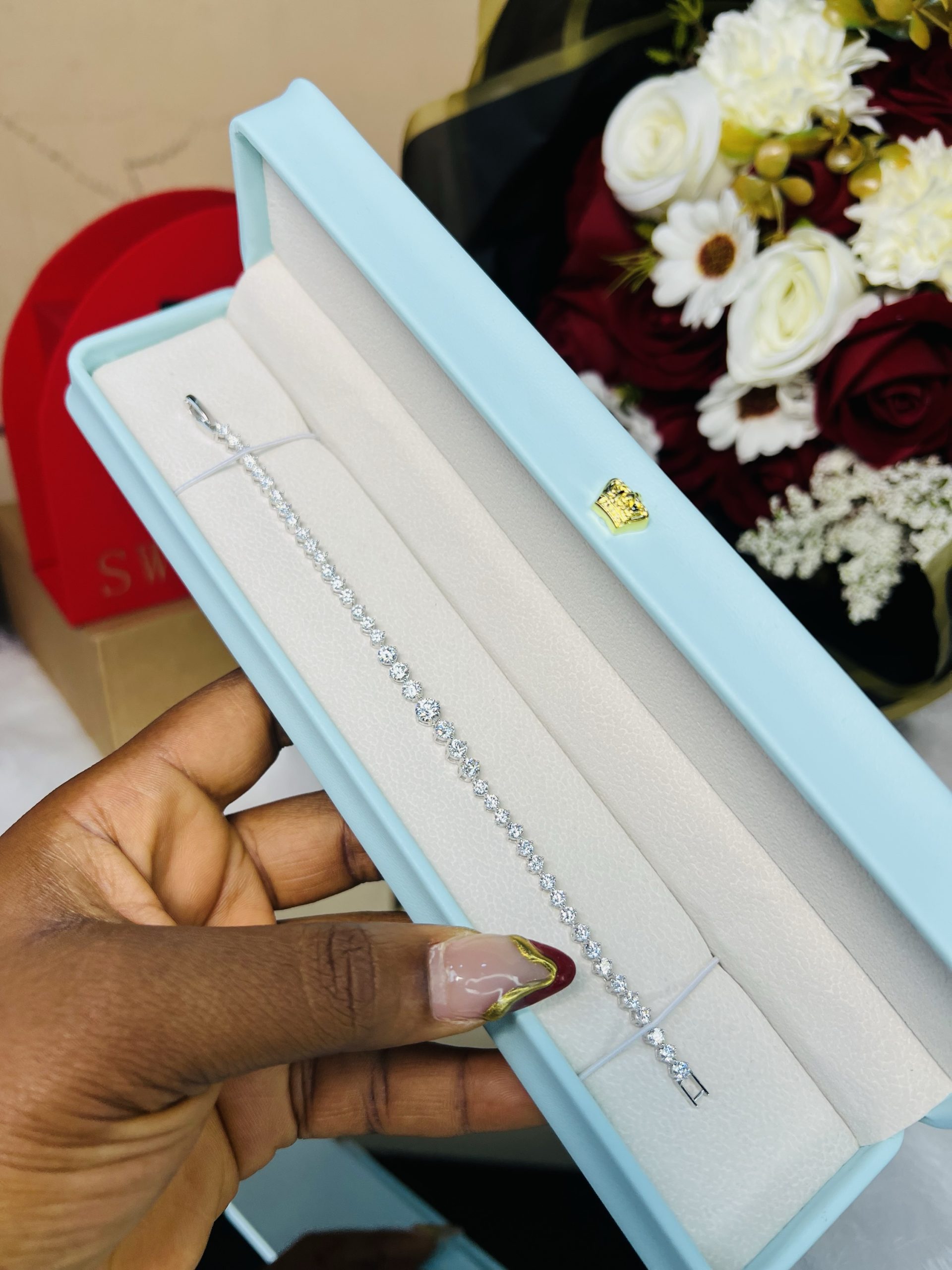 This bracelet is crafted from 925 silver and set with 42 round-cut synthetic moissanite stones totaling 5.90 carats. Total weight: 7.7g. Authenticated and reviewed by certified appraisers.