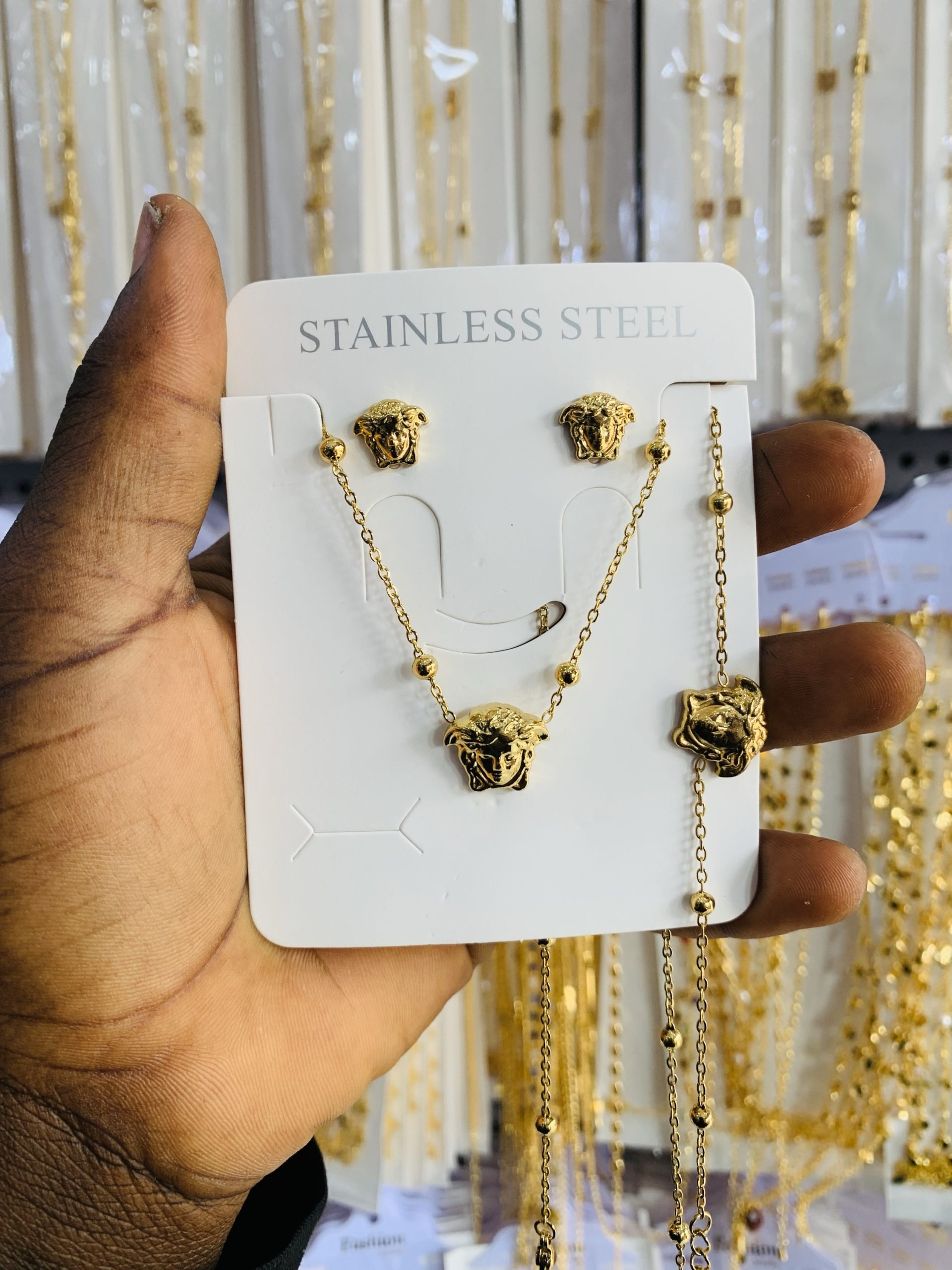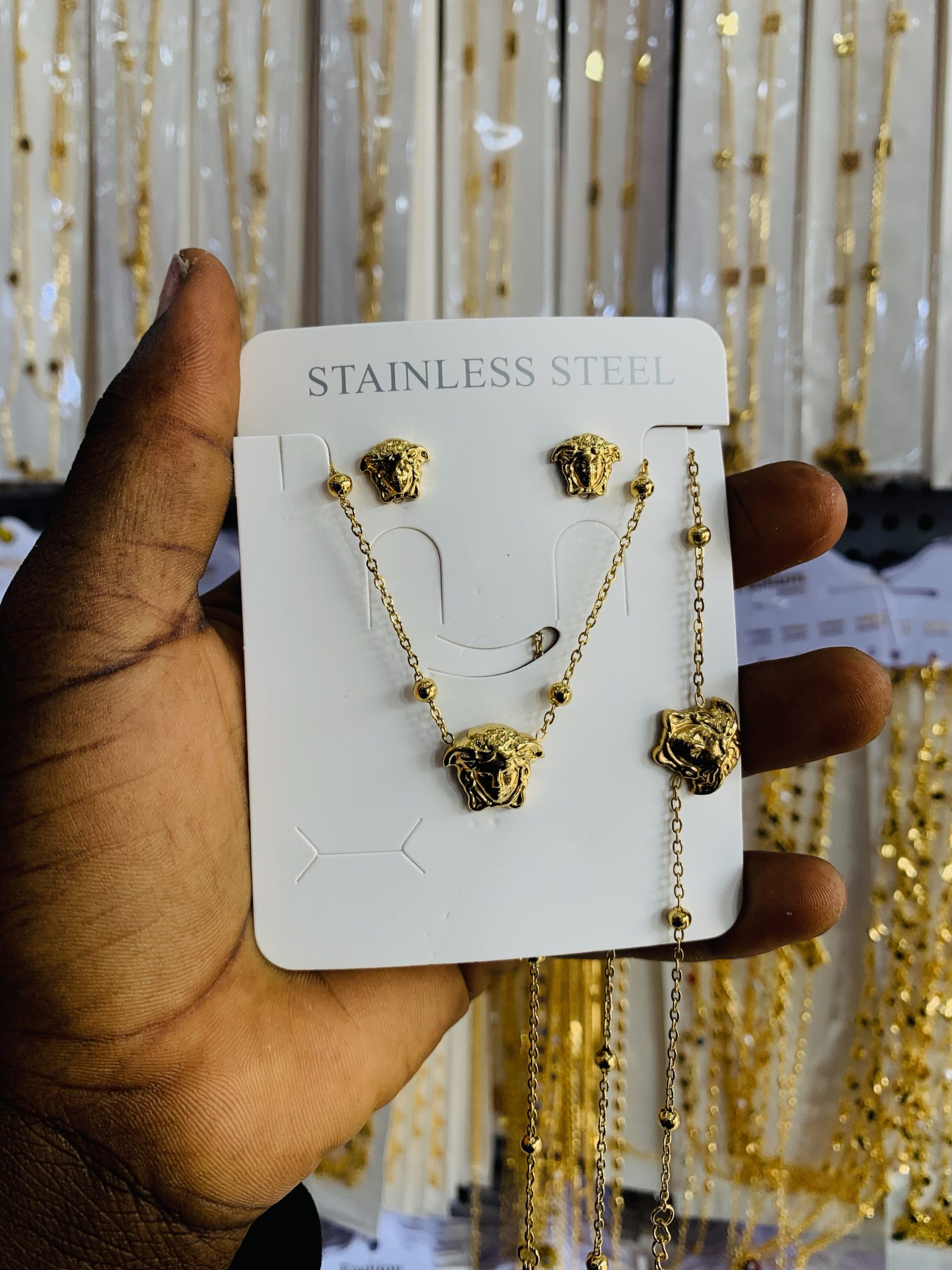Previous Product Next Product Versace steel gold set ₦2,000 Categories: Bracelets, Earrings, Necklaces 9 in stock Versace steel gold set quantity Buy Now Reviews (0) Reviews There are no reviews yet. Be the first to review “Versace steel gold set” Cancel replyYour email address will not be published. Required fields are marked *Your rating * Rate… Perfect Good Average Not that bad Very poor Your review *Name * Email * Save my name, email, and website in this browser for the next time I comment. Opens in a new window Tweet This Product Opens in a new window Share on Facebook Opens in a new window Pin This Product Opens in a new window Mail This Product Related products Quick View Out of Stock Quick View EarringsStainless steel earrings 009 ₦1,000 Read more Quick View Quick View EarringsMD LUXURY MAPLE EARRING ₦3,500 Buy Now Quick View Quick View EarringsKorean statement earring 055 ₦1,500 Buy Now