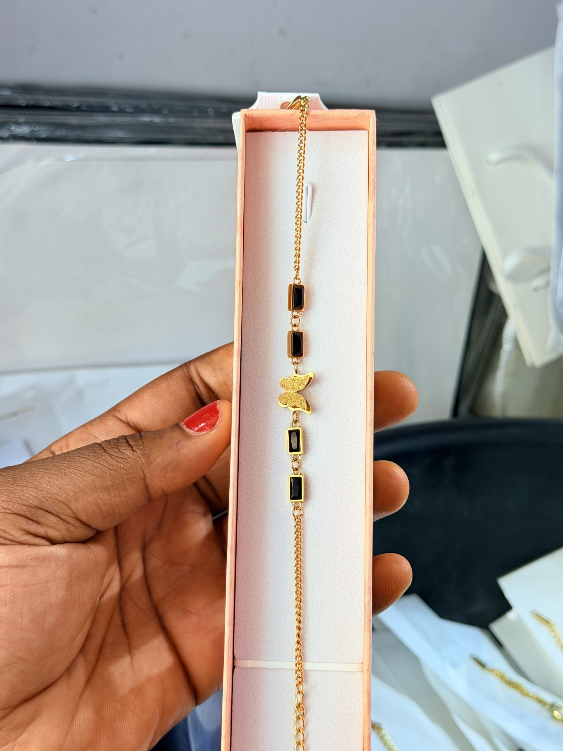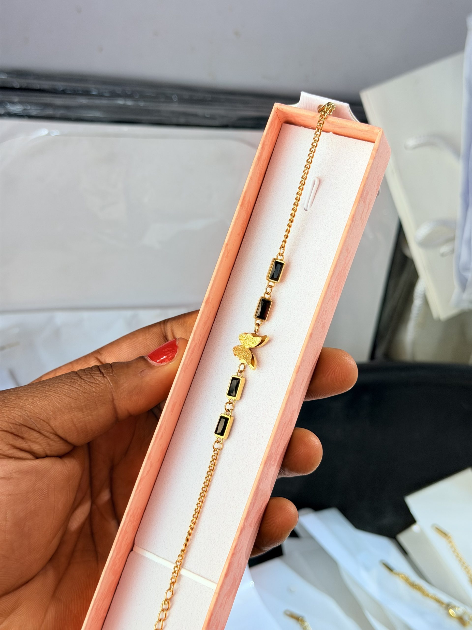 Previous Product Next Product Butterfly black steel bracelet ₦2,500 SKU: 63117 Category: Bracelets 69 in stock 63117 Butterfly black steel bracelet quantity Buy Now Reviews (0) Reviews There are no reviews yet. Be the first to review “Butterfly black steel bracelet” Cancel replyYour email address will not be published. Required fields are marked *Your rating * Rate… Perfect Good Average Not that bad Very poor Your review *Name * Email * Save my name, email, and website in this browser for the next time I comment. Opens in a new window Tweet This Product Opens in a new window Share on Facebook Opens in a new window Pin This Product Opens in a new window Mail This Product Related products Quick View Quick View Moissanite Jewelries, BraceletsTennis moissanite bracelet ₦80,000 Buy Now Quick View Quick View BraceletsCeramic bracelet 03 ₦2,500 Buy Now Quick View Quick View BraceletsWhite Vca bracelet ₦3,000 Buy Now