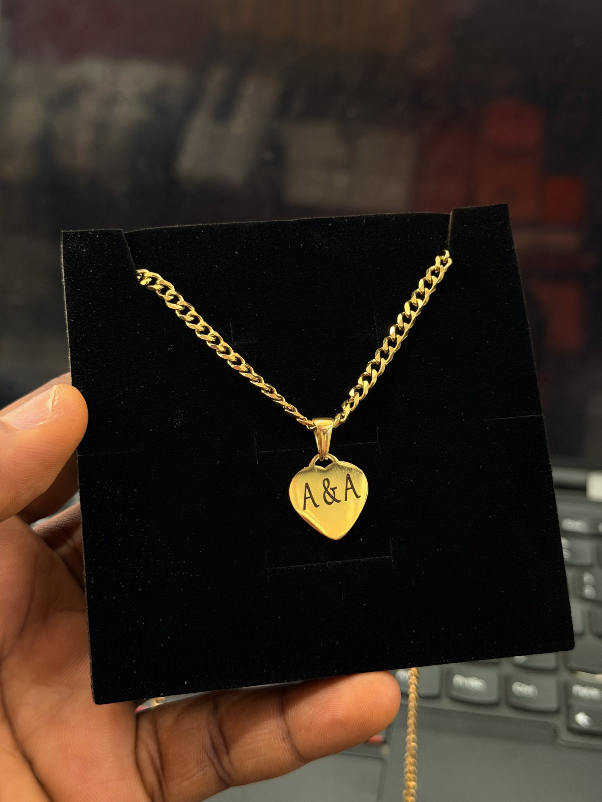 Previous Product Next Product Engraved small heart necklace with paper box ₦6,800 SKU: 48457 Category: Customizables 13 in stock 48457 Engraved small heart necklace with paper box quantity Buy Now Reviews (0) Reviews There are no reviews yet. Be the first to review “Engraved small heart necklace with paper box” Cancel replyYour email address will not be published. Required fields are marked *Your rating * Rate… Perfect Good Average Not that bad Very poor Your review *Name * Email * Save my name, email, and website in this browser for the next time I comment. Opens in a new window Tweet This Product Opens in a new window Share on Facebook Opens in a new window Pin This Product Opens in a new window Mail This Product Related products Quick View Quick View CustomizablesGold cross engraved necklace with paper box ₦6,800 Buy Now Quick View Quick View CustomizablesEngraved Silver flat Necklace 002 ₦6,800 Buy Now Quick View Quick View CustomizablesGold flat Engraved necklace with paper box ₦6,800 Buy Now