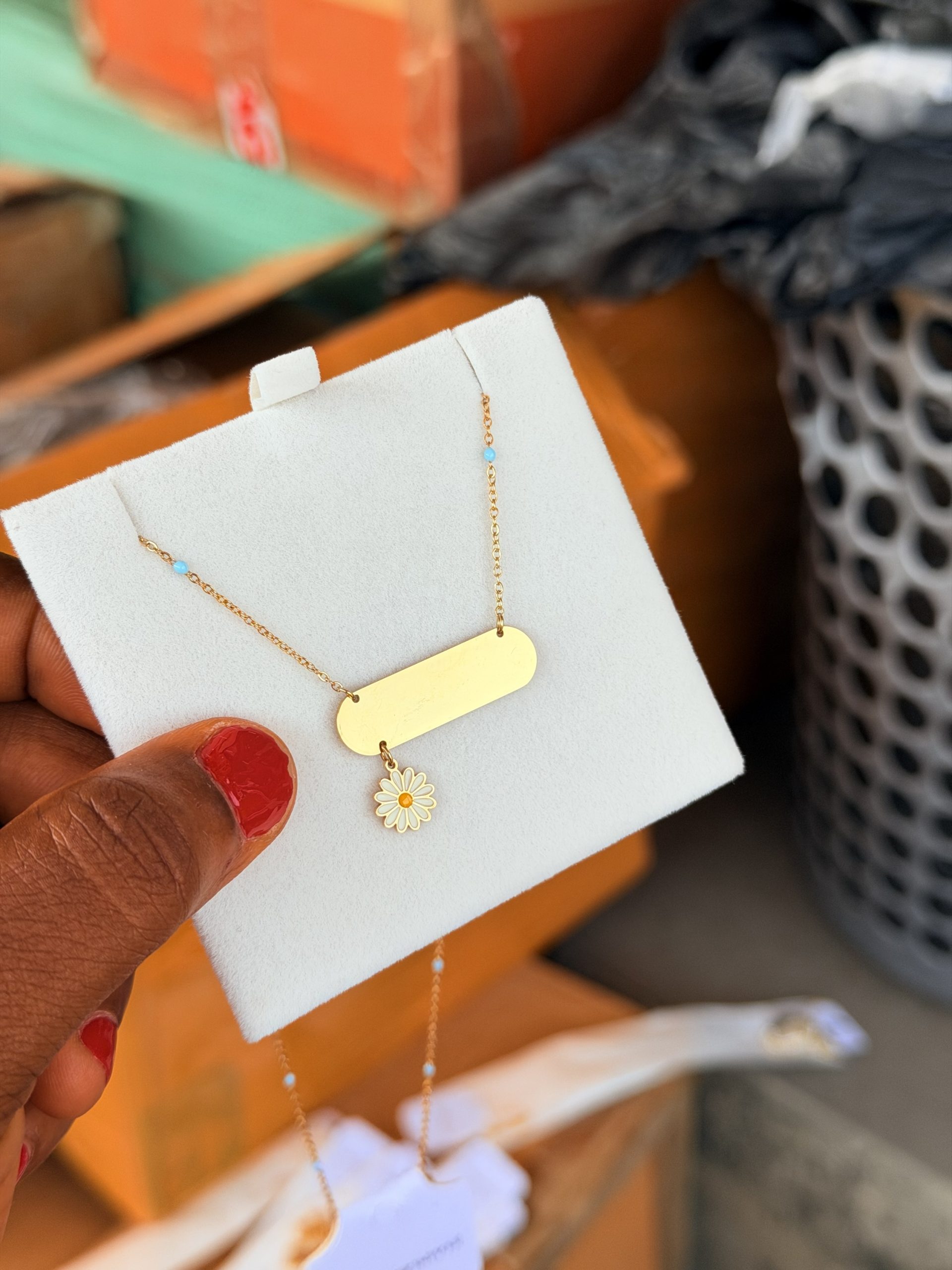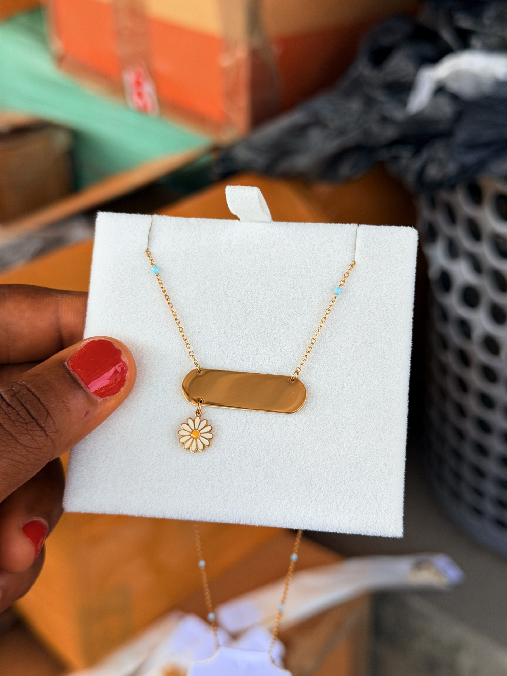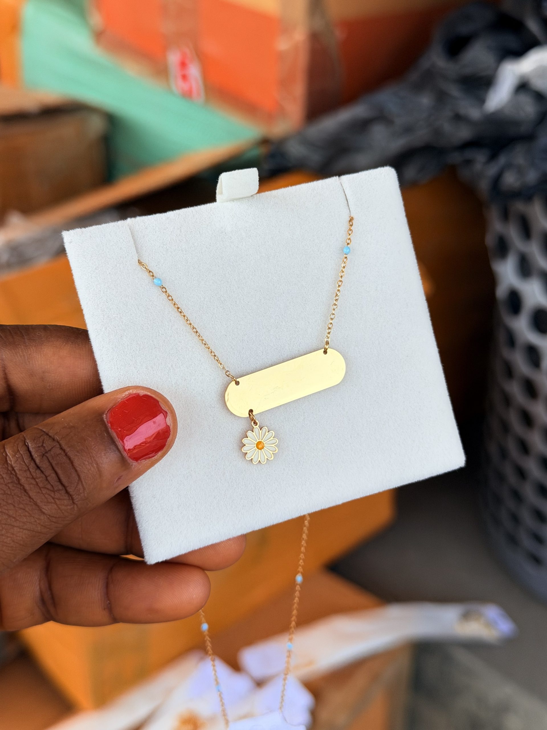 Previous Product Next Product Engraved sunflower dropping necklace ₦6,000 SKU: 62583 Category: Customizables 72 in stock 62583 Engraved sunflower dropping necklace quantity Buy Now Reviews (0) Reviews There are no reviews yet. Be the first to review “Engraved sunflower dropping necklace” Cancel replyYour email address will not be published. Required fields are marked *Your rating * Rate… Perfect Good Average Not that bad Very poor Your review *Name * Email * Save my name, email, and website in this browser for the next time I comment. Opens in a new window Tweet This Product Opens in a new window Share on Facebook Opens in a new window Pin This Product Opens in a new window Mail This Product Related products Quick View Quick View CustomizablesGold stretchy bracelet ₦6,000 Buy Now Quick View Quick View CustomizablesSilver circle locket necklace with paper box ₦11,000 Buy Now Quick View Quick View CustomizablesEngraved gold black mini Cuban ₦6,000 Buy Now